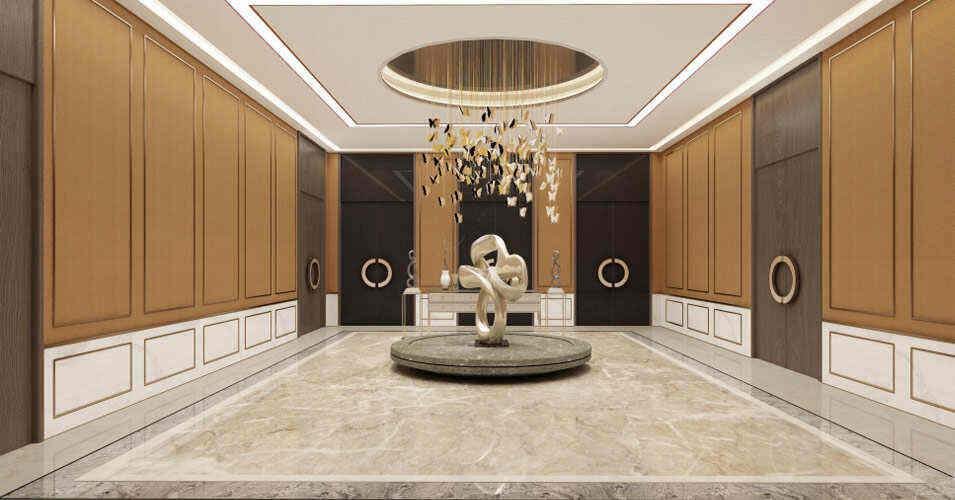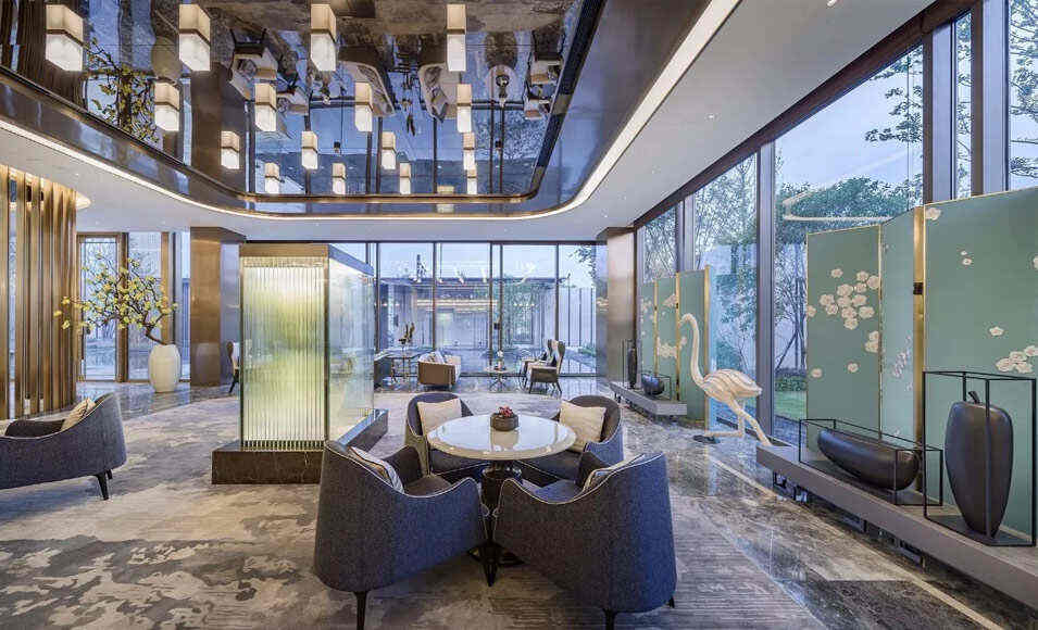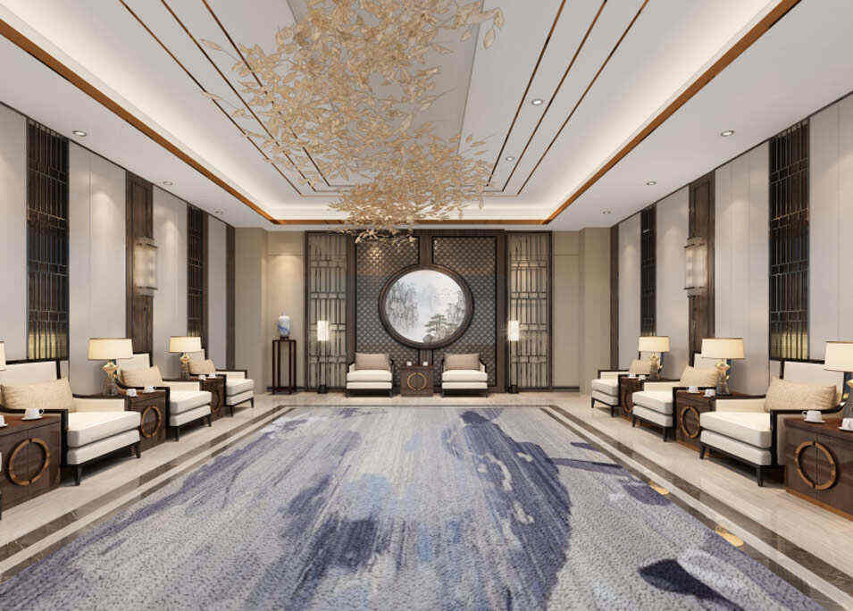 設(shè)計(jì)介紹:地面充滿藝術(shù)氣息的花瓣圖案,中性色木材的座椅,斑駁不均的紋理前臺(tái)桌,以及有紋理的墻壁,幾種元素相融合,給空間帶來(lái)了意想不到的美感。休息室上空的方塊燈飾,紫色的座椅、雕塑藝術(shù)擺件,清新的屏風(fēng)構(gòu)成了一個(gè)浪漫多姿的休閑洽談區(qū),老板辦公室和貴賓室看起來(lái)典雅,莊重,采用木色的、灰色為主色,皮質(zhì)的木色沙發(fā)、配上裝滿藝術(shù)品的櫥柜,類似古代的屏風(fēng),沉斂深厚、文化品位濃郁,打造富有激進(jìn)韻味的空間。