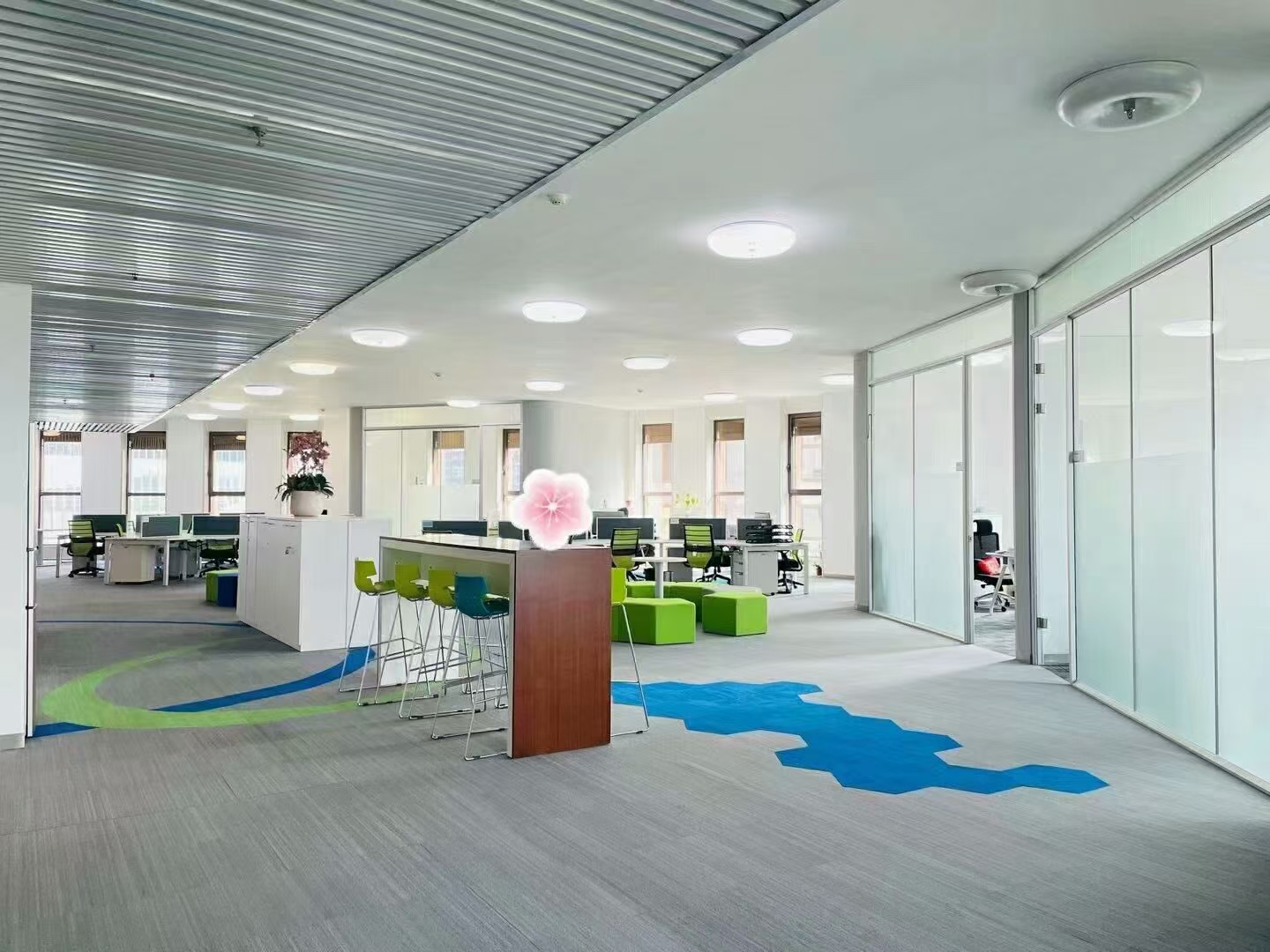 3、某公司前廳區(qū)右側(cè),是直通二樓的木飾面步梯,臺(tái)階加寬,高度錯(cuò)落有致,LOGO藍(lán),粉,灰與原木色相間,這不僅僅是上下樓梯,更承載著員工的休憩與溝通交流功能,因此增強(qiáng)該區(qū)域的趣味性。步梯后方和右側(cè)辦公室吧臺(tái)巧妙的設(shè)計(jì)成一個(gè)連貫性的茶水區(qū),吧臺(tái)錯(cuò)落在茶水柜延伸出的區(qū)域,搭配綠植,增添生機(jī)和活力。