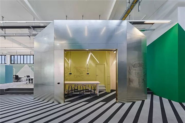 4、創(chuàng)意工業(yè)風(fēng)汽車公司辦公室裝修設(shè)計:室內(nèi)材質(zhì)的選擇遵從于汽車產(chǎn)業(yè)的工業(yè)屬性。未加工鋅板、天然木材和鋼材表面共同構(gòu)筑室內(nèi)幾何單元。有著半通透質(zhì)感的聚碳酸酯材料板構(gòu)筑了室內(nèi)眾多隔間墻體。聚碳酸酯與原木框架的結(jié)合,讓這里呈現(xiàn)出建筑構(gòu)造較初始的發(fā)展?fàn)顟B(tài)中。初始化工業(yè)風(fēng)質(zhì)感在強(qiáng)烈的色彩映襯下和時尚的家具點綴下,形成鮮明的質(zhì)感對比,帶來豐富的空間體驗。近似黑白對比的條紋地毯,在空間中不斷演繹著微妙的圖形變化,帶來精彩而時尚的視覺驚艷。